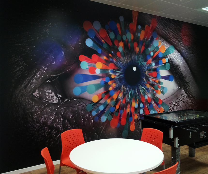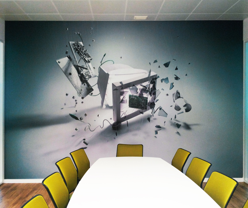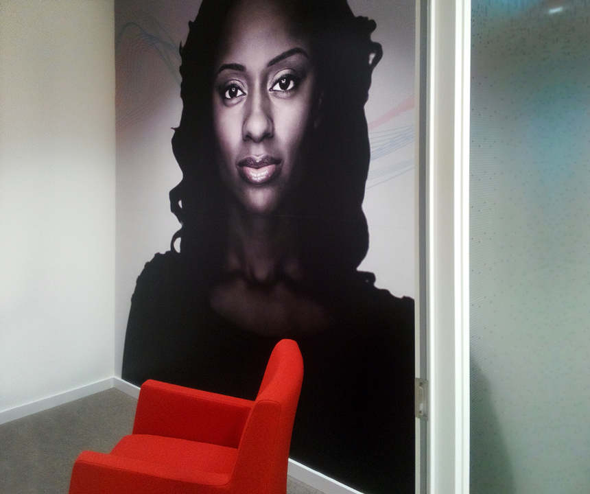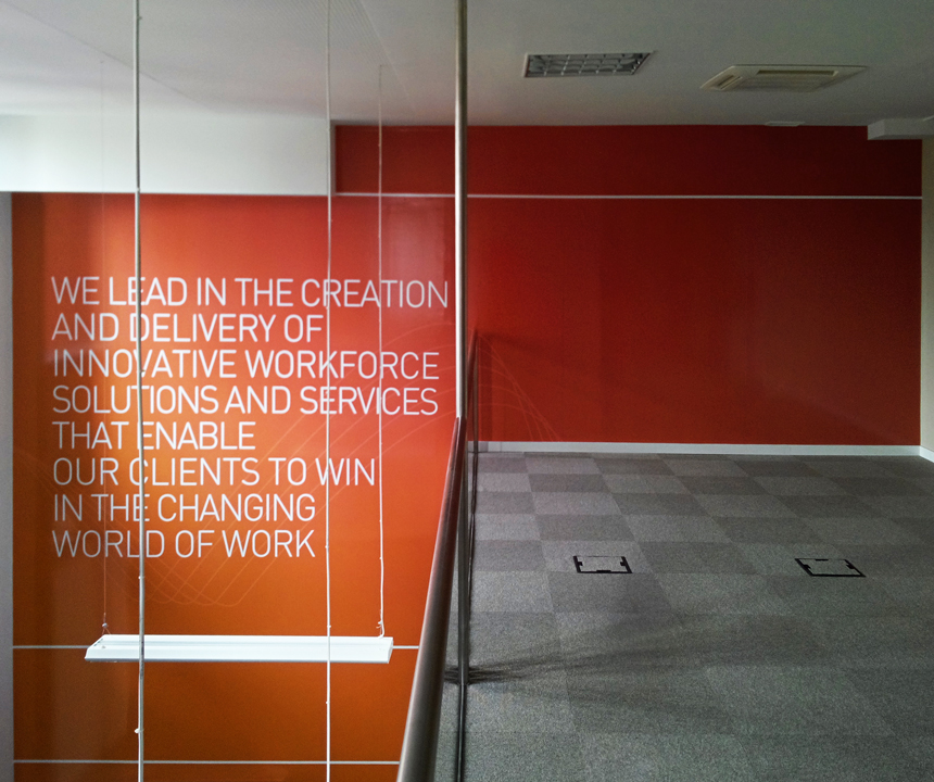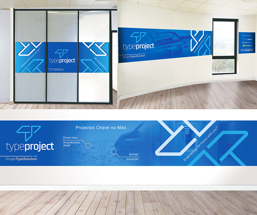 Produção em vinil permanente laminado, sinalética portas e logótipo em acrílico com aplicação de vinil prata texturado